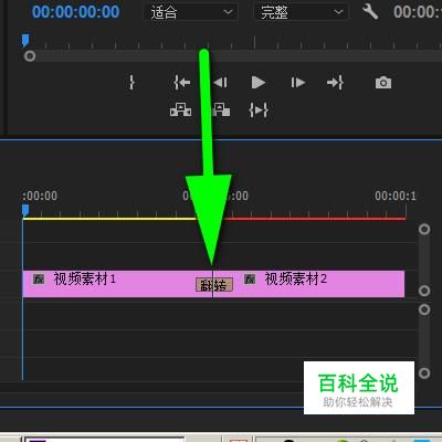 鼠标点击“翻转”向右边的序列这里挪,挪到两视频相连接的位置上,再放开鼠标,那么,该过渡效果就应用在这两段视频上了。拉大视频素材的显示范围,就可以看到两视频中间显示着“翻转”两个字。