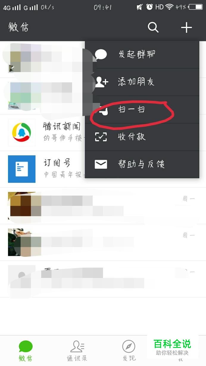 首先打开微信,点击右上角的“+”,接着再点击扫一扫
