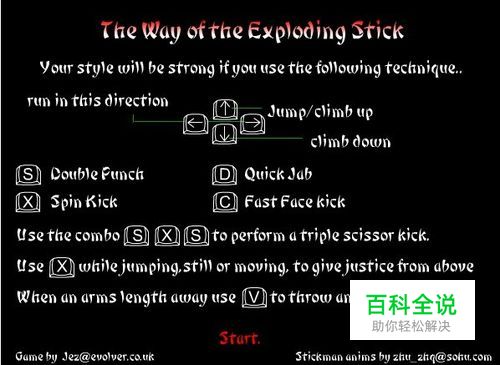 操作说明:游戏自带的说明如下图,看起来是不是很乱,下面我将中文翻译到这里:使用方向键控制移动和跳跃,S、D是出拳,X、C是踢脚,SXS是使用必杀。