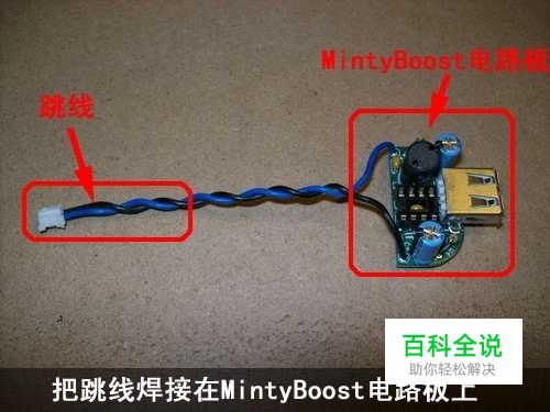 装MintyBoost套装。本来是把装电池在盒内, 这里是把跳线焊接在MintyBoost的电路板上。它会把MintyBoost电路与锂电池充电器电路相连。正负极要连接无误。 把MintyBoost和锂电池以及充电器电路连接起来进行测试。(保证电池有电荷)