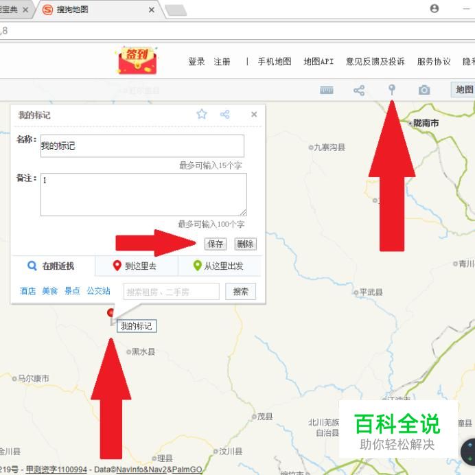 首先点击地图右上方工具栏的标记图标,然后鼠标单击需要标记的位置,接着会弹出“我的标记”窗口。可以在备注栏中输入数字“1”,表示第一个地点。输入完成后,点击“保存”即可。