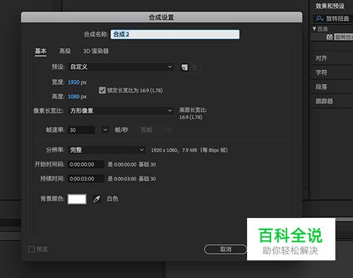 进入AE软件界面,ctrl+n新建合成,帧速一般设置为30f,分辨率为完整。