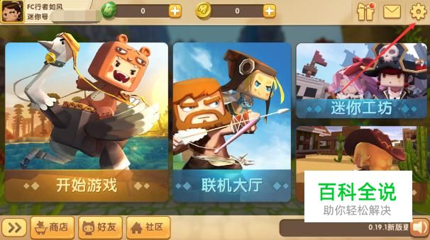 首先打开手机迷你世界APP软件并登录游戏的账号,接着点击游戏主页右上角的设置图标。