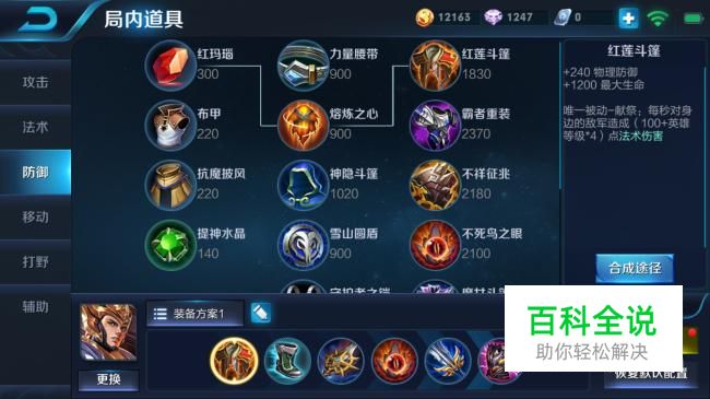 红莲斗篷,增加240点物防和1200最大生命,被动能够每秒对周边敌军造成相应的等伤,确保前期战斗力。