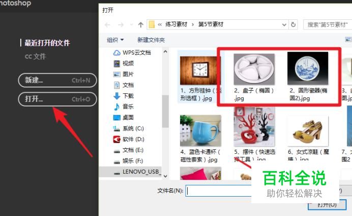 运行ps软件,点击打开,找到需要抠取的两张图片,如图