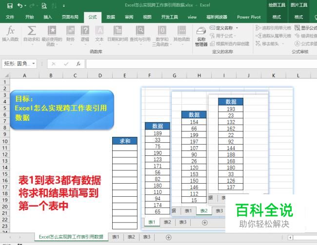 表格中有四个表,将表1到表3的数据进行相加填入到“Excel怎么实现跨工作表引用数据”中