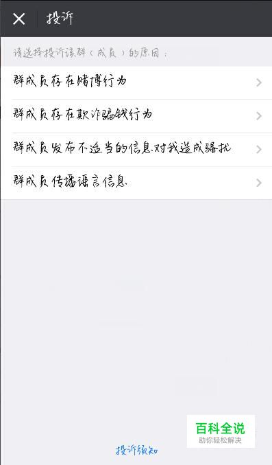 点击“投诉”:若果微信群中有某个人或者部分人群存在违法行为,仍在群里传播不良信息的,可以对这一部分人进行投诉,进入投诉页面选择投诉的原因即可。