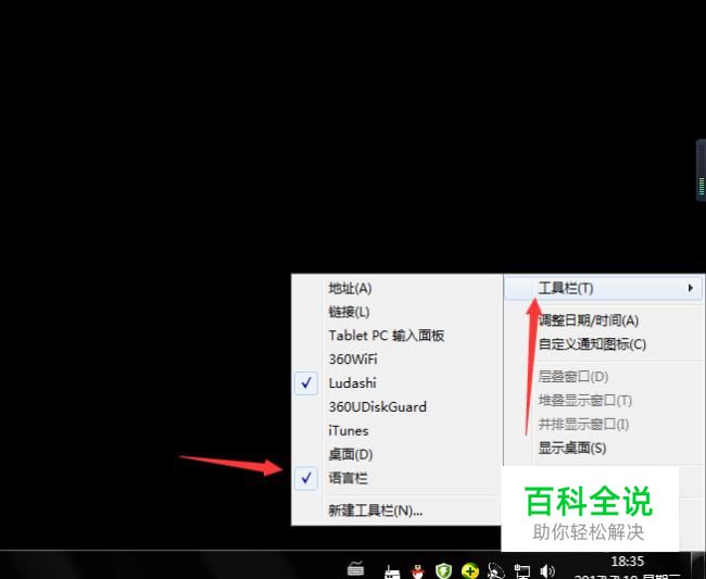当输入法不见的时候可以用鼠标右键点击右下角的栏目。在出现的选项点击工具栏。然后在工具栏出现的选项点击选择语言栏看能不能出现。如果不能出现的话得用其他方式。