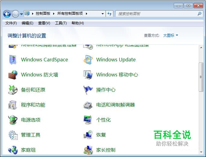 在控制面板中,将查看方式设置为“大图标”,然后点击“电源选项”