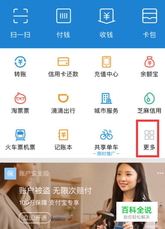 打开支付宝,登录自己的支付宝账号,点击更多。