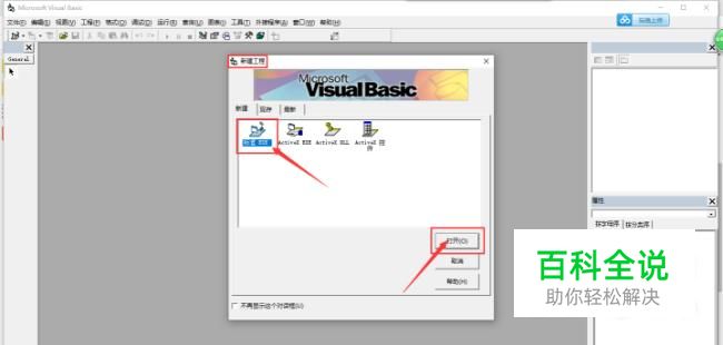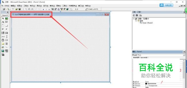 启动VB程序,在“新建工程”界面选择【标准 EXE】,点击【打开】,进入工程页面后,再将最右端下方属性窗口中Form1的“Caption”的内容改为“Sub子程序的递归调用——求两个数的最大公约数”