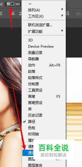 在界面顶部菜单栏中点击窗口,将通道选中,这样在状态栏就会有通道的属性栏。