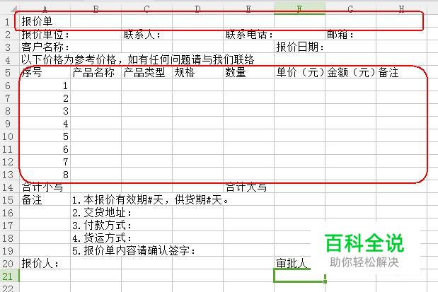 我们需要现将第1行(报价单所在行)和第5-13行(报价单内容)的表格线画出来并进行适当的合并单元格操作。