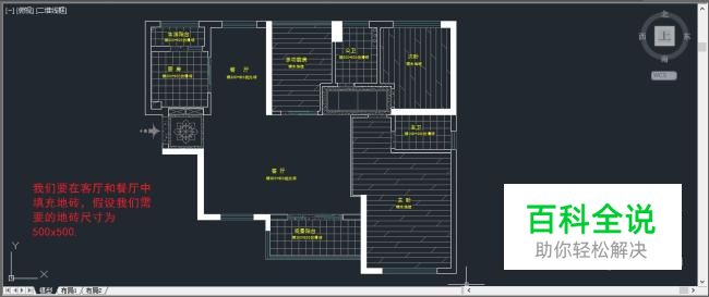 首先我们打开一张室内设计的模板图纸,我们需要在客厅和餐厅中设计我们需要的尺寸的地砖。