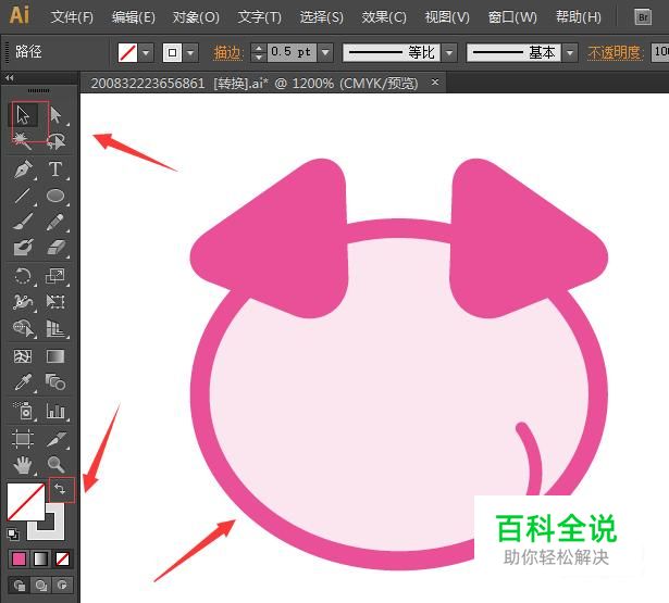 接着我们第一步:选择钢笔工具;第二步:将背景色设置为粉红色;第三步:画猪头,猪耳朵,如下图所示。