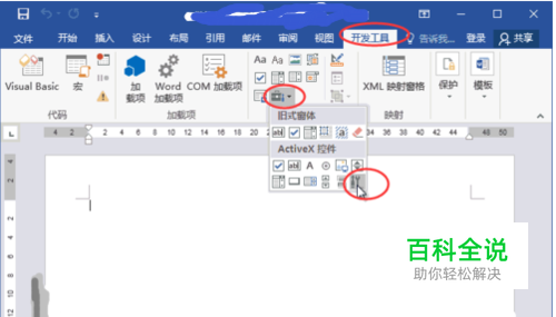 首先,我们要确保我们word工具栏中有开发工具,如果没有,请参考经验引用,在工具栏中添加开发工具选项。第一步,我们选择开发工具,找到控件,进而找到旧式窗体-其他控件按钮,点击进入,如图所示。