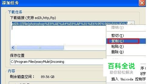 启动电驴自动提示“添加任务URL“,在URL链接中鼠标右键“复制”如图
