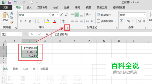 选中这些数字,点击“字体”选项卡下的按钮,如图