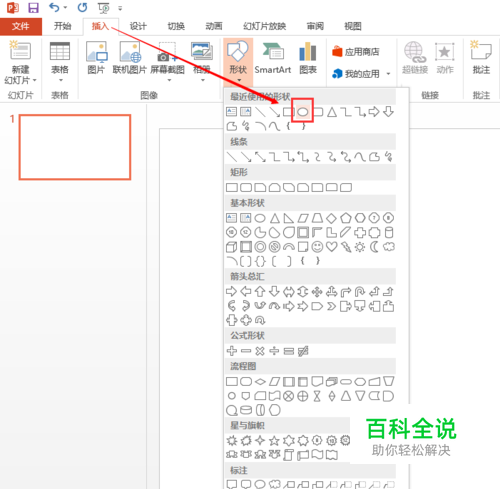 打开PowerPoint2013,新建一个ppt演示文档;接着点击【插入】→【形状】,在【形状】中选择椭圆,如图所示