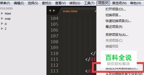 sublime如何新建工程、项目的。 第一可以直接把一个或者多个工程拖到左侧FOLDERS文件夹管理界面;第二可以打开:项目->添加文件夹到项目。