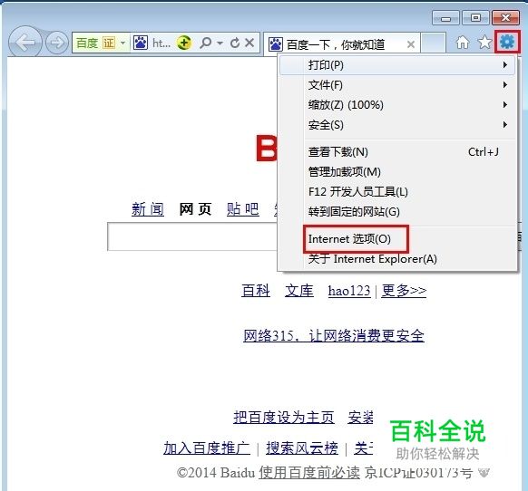 2.点击浏览器最右上角的齿轮符号 ,然后点击“Internet 选项” 如图