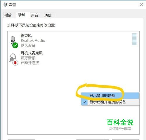 2、查看“录制 ”标签栏中有没有带网卡图标的选项,如果没有,则在对话框的空白处右击鼠标,勾选“显示禁用的设备”,如下图所示。