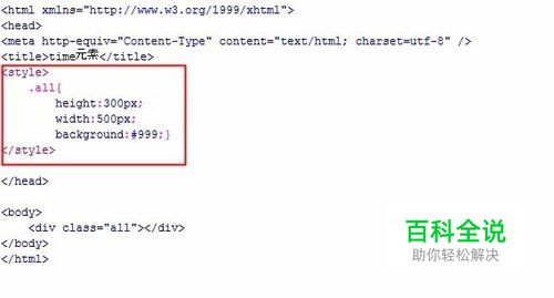 第二种写法: <head> <meta http-equiv="Content-Type" content="text/html; charset=utf-8" /> <title>time元素</title> <style> .all{ height:300px; width:500px; background:#999;} </style> </head> <body> <div class="all"></div> </body>