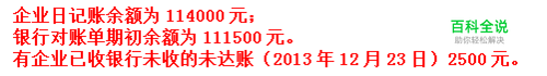 本篇经验将介绍出纳录入银行对账期初数据的方法。 相关资料如下: 企业日记账余额为114000元;银行对账单期初余额为111500元。有企业已收银行未收的未达账(2013年12月23日)2500元。