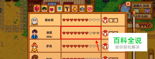 谢恩最喜欢的东西是辣椒,这种作物种下去可以重复多次收获,在温室种1棵就有源源不断的供应了,同时辣椒也是路易斯的最爱。 每周送两次辣椒给谢恩,这样很快就能凑够八颗心。