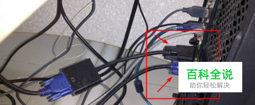 首先将电脑关机,将两个显示器的线接头电脑后面的插口上,如图
