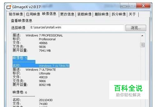 二、制作重置系统 由于重置是“格式化C盘+将指定映像恢复到C盘”,因此我们只要通过“imagex”命令将“install.wim”指定映像恢复到系统分区即可。 首先下载好Win7安装文件,然后使用WinRAR将全部文件解压到E盘备用。接着运行下载 的“Gimagex”并切换到“映像信息”,选择“E:\sources\install.wim”,单击“显示信息”,记住需要用作为重置对象的映像卷号即可。比如,笔者使用的是旗舰版映像,它在“install.wim”中的映像卷号位“5”(图1)。