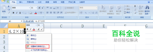 选中要设置成上标或下标的内容后,不一定要单击鼠标右键,也可以点击Excel表格右上角的“格式”下的“设置单元格格式”,如图所示。