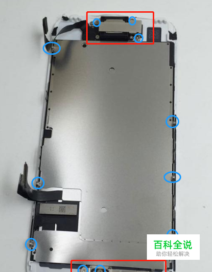 将屏幕上的固定铁片拆除,拆的时候只拆听筒固定铁片(图1中上面红框)、指纹固定铁片(图1下面红框)、屏幕固定铁片(图2),听筒和指纹不需要拆下,屏幕固定铁片拿的时候要慢,从听筒方向慢慢拿开一条缝,用撬棒将屏幕排线从铁片上翘下来,一定要慢。