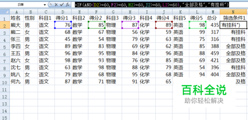 2. IF AND组合公式实现条件筛选: 如图示列表,有九位同学各自五门课程的成绩单,从中筛选出来至少有一门挂科的同学,公式为: =IF(AND(D2>=60,F2>=60,H2>=60,J2>=60,L2>=60),"全部及格","有挂科") AND语法为: AND(公式1,公式2,公式3......) 只要小括号内的公式全部满足,则AND公式整体值为真;否则有任何一个公式为假,整体值为假;公式之间为逻辑与的关系; IF语法为: IF(公式,值1,值2) 值1为公式值为真时的输出值, 值2为公式值为假时的输出值; 那么此时公式:=IF(AND(D2>=60,F2>=60,H2>=60,J2>=60,L2>=60),"全部及格","有挂科") 代表D2/F2/H2/J2/L2这5个单元格的值(五门科目得分),全部大于等于60,则为“全部及格”,否则则为“有挂科”