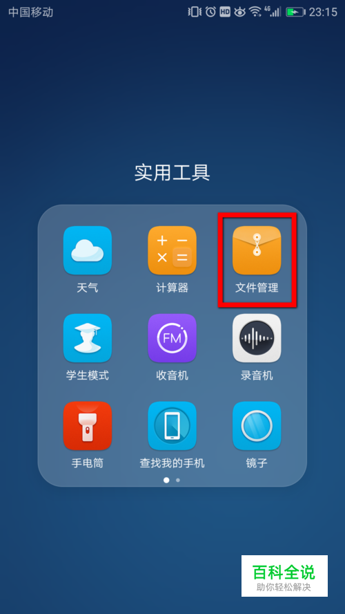 每个手机都有一个文件管理器,先在手机上找到文件管理的图标,点击该图标进入。