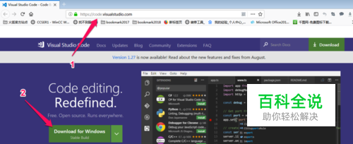 首先需要下载VSCode,打开浏览器输入code.visualstudio(进入到官网),然后进入VSCode的首页,按照下图中红色箭头指示步骤点击下载,大家可以根据自己的操作系统进行下载,VSCode支持windows OS等系统,小编的是windows7,所以直接下载就可以了,如下图: