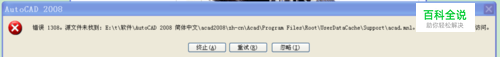 我在安装CAD2008的时候遇到了“错误1308,源文件未找到,……support/acad.mnl“的问题,详见下图所示。