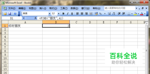 输入查找函数“ =FIND("朋友",a1)”,查找a1中“朋友”这个字符所在位置。