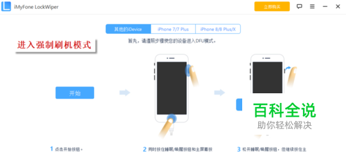 按照软件界面提示,设置手机进入DFU模式 (强制刷机模式): 1) 点击【开始】>> 同时按住苹果手机开关键和主屏幕键,8-10秒 >> 松开开关键,主屏幕键不动继续按住5秒钟。 2) 如果进入DFU模式失败, 请按照界面底部步骤, 设置手机进入恢复模式。 确保手机和电脑连接稳定 >> 同时按住开关键和主屏幕键 >> 继续按住这2个键, 直到手机屏幕上出现连接iTunes图标。