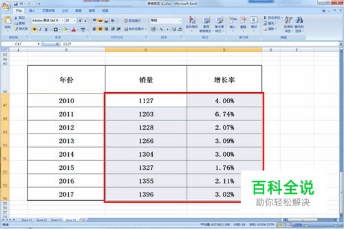 以下图表格为例,我们就用这个年份、销量和增长率来做个柱状图与折线图的组合形式图表。首先,拖动鼠标,选中销量和增长率两项的所有数据。