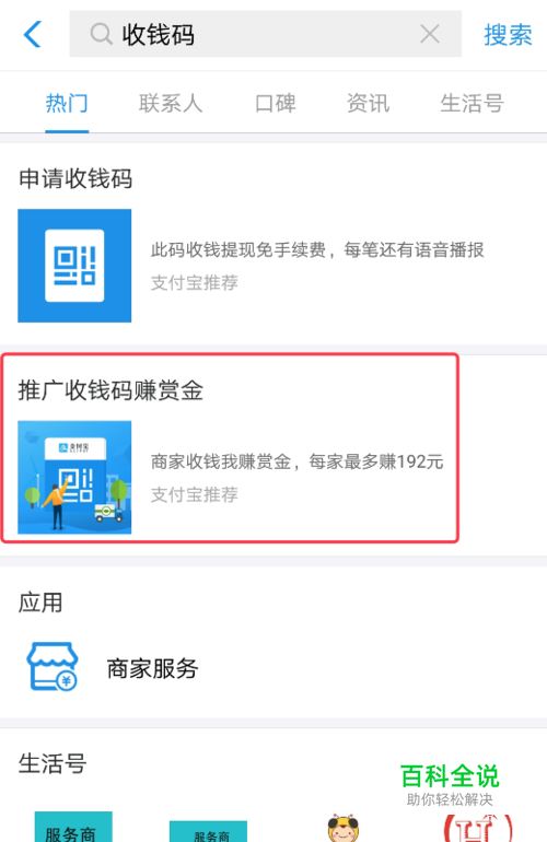 如果你是商家,怎么推荐好友商家参加活动呢?首先在支付宝中搜索【收钱码】或【红包码】