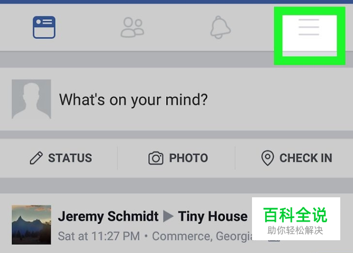轻触 ☰。它位于屏幕右下角(iPhone手机),或屏幕右上角(安卓设备)。 有些版本的Facebook应用程序使用三个点来代替☰图标。