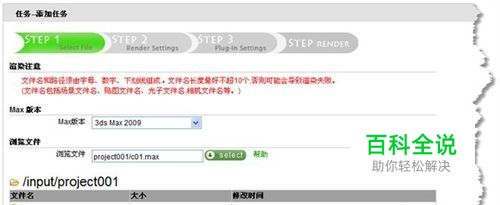 选择要渲染的场景文件 登入到Renderbus系统以后,点击左边菜单“提交Max渲染”,出现如下画面。相关输入项介绍如下: Max版本:为您的场景渲染选择合适的Max版本,除了注明是32位的以外,默认都是64位软件。 浏览文件:点击“select”,在弹出框中逐级点击文件夹图标,进入到max文件所在的目录,选择要渲染的max文件名。 选择完毕之后,点击“下一步”,Renderbus会自动对你的场景进行检测,分析场景中预设的的参数、检查是否丢失贴图。