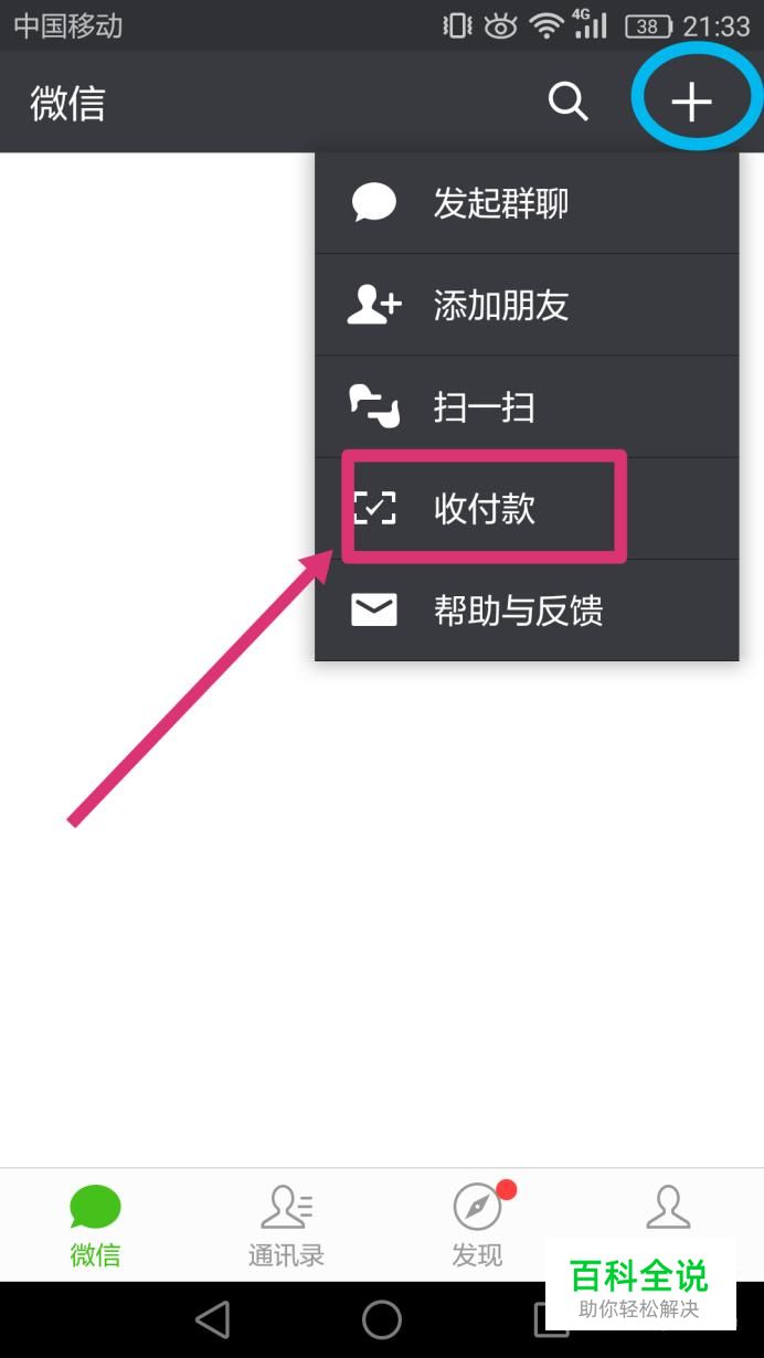 登录进入微信主页面,在页面上方点击十字图标,然后选择“收付款”。如图所示。