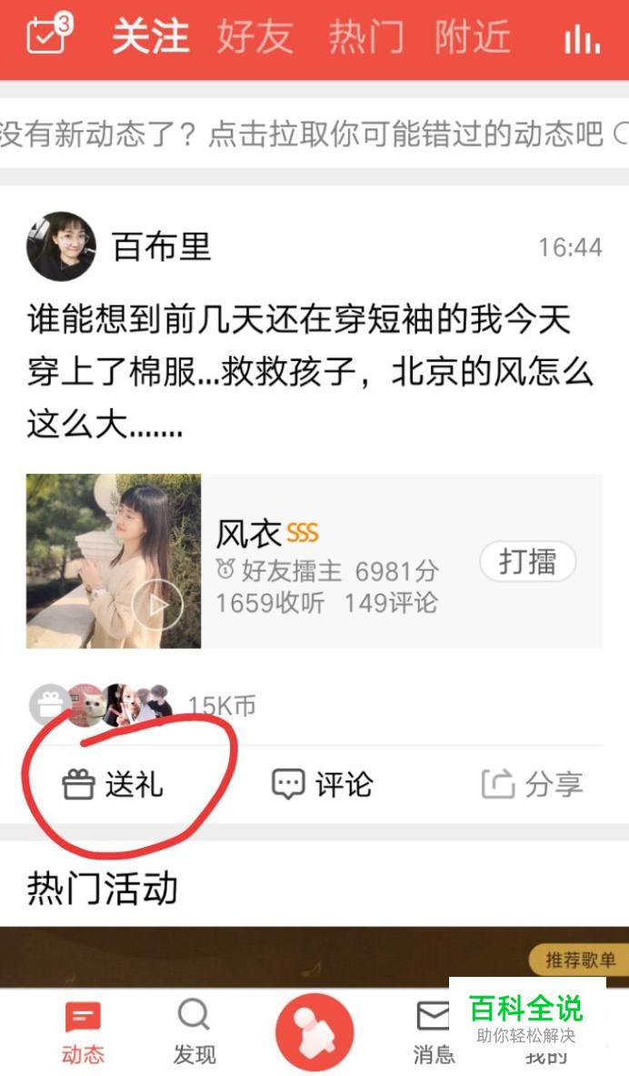 在动态页面可以选择自己想要送礼物的歌曲,如下图所示,点击送礼。