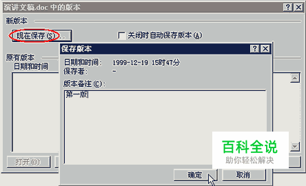 以演讲文稿为例,当第一稿录入完毕后,执行“版本”命令,在弹出的窗口中点击“现在保存,紧接着在出现的“保存版本”窗口中输入“第一稿”,如图所示,最后点击“确定”完成保存。