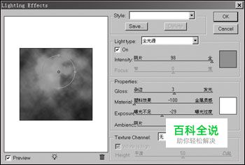 使用“滤镜→渲染→光照效果”命令,在弹出的光照效果对话框设置光源类型为“全光源”光源色为橘红色,调整光源的色彩和相对位置,如图所示,单击OK按钮确认。 图1
