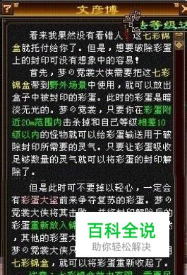 活动内容: 在活动期间,玩家可在苏州(168,168)文彦博处领取活动任务。领取任务时玩家会获得道具"七彩锦盒",该道具需要在野外场景使用,使用后在玩家身边出现一个图腾:被封印的彩蛋。