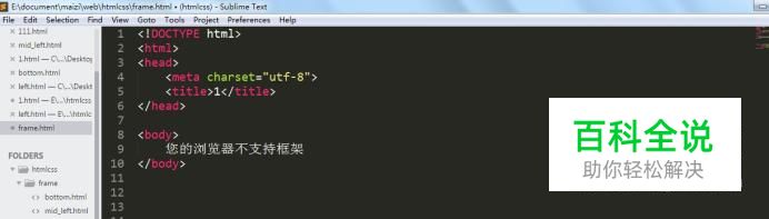 然后写上网页的基本结构,内容如下 <!DOCTYPE html> <html> <head> <meta charset="utf-8"> <title>1</title> </head> <body> 您的浏览器不支持框架 </body> </html>