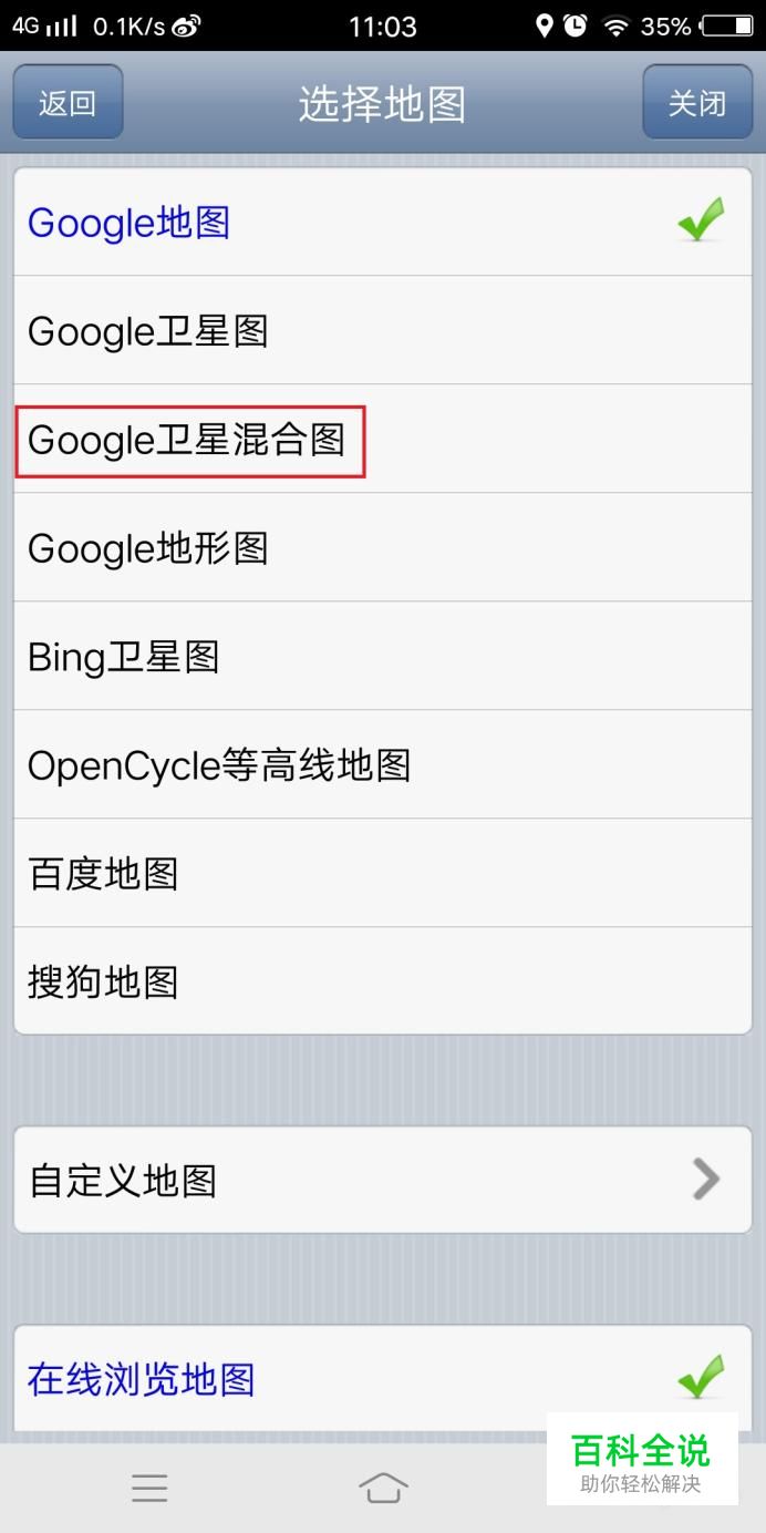 进入“选择地图”页面后,选择“Google卫星混合图”,即可切换成地图及卫星图叠加模式,如图所示